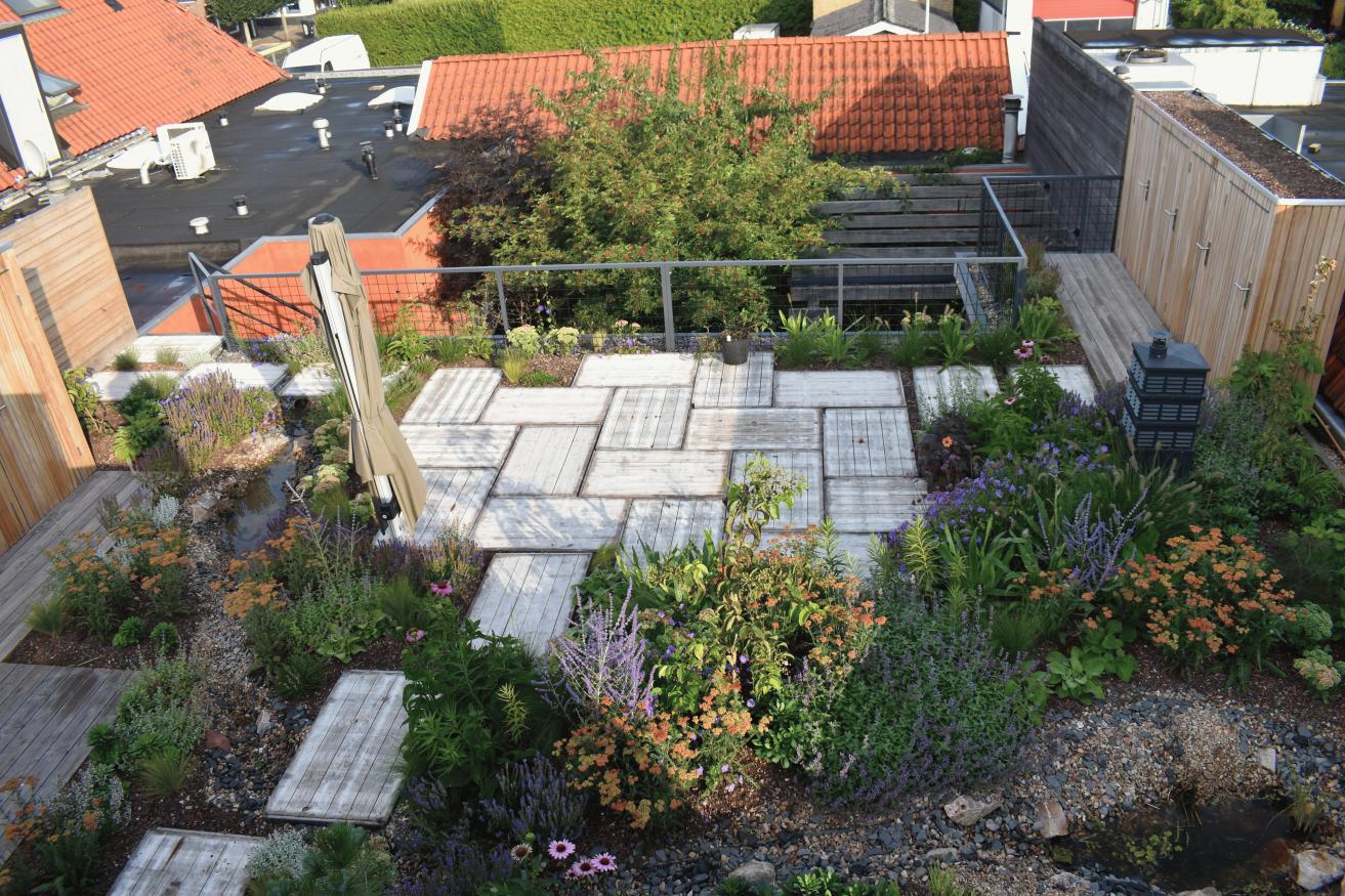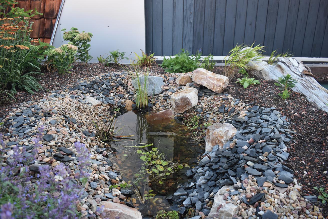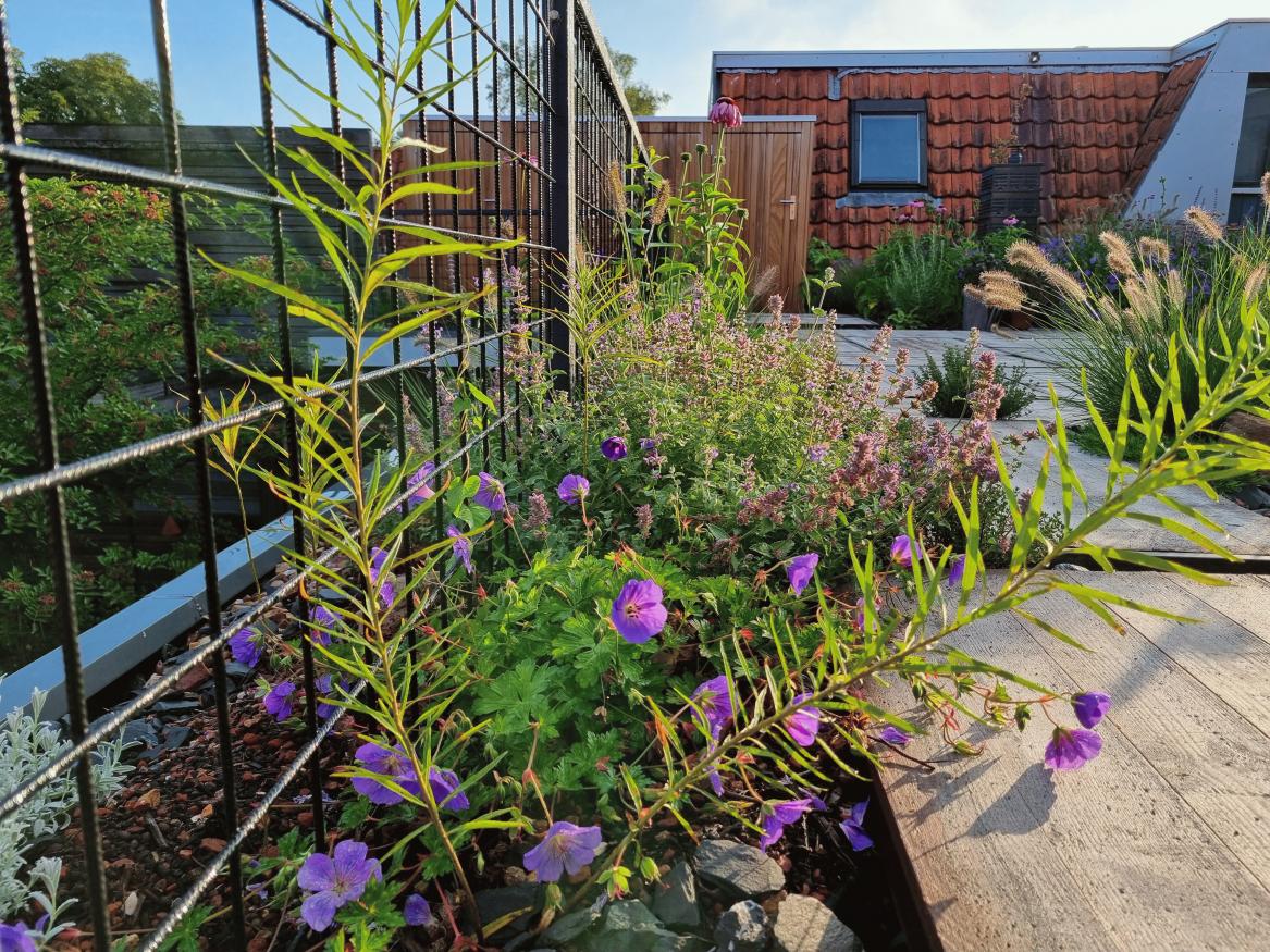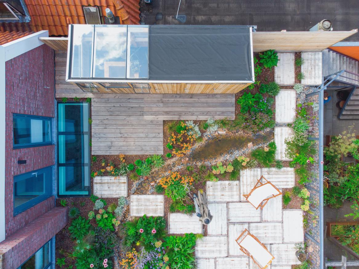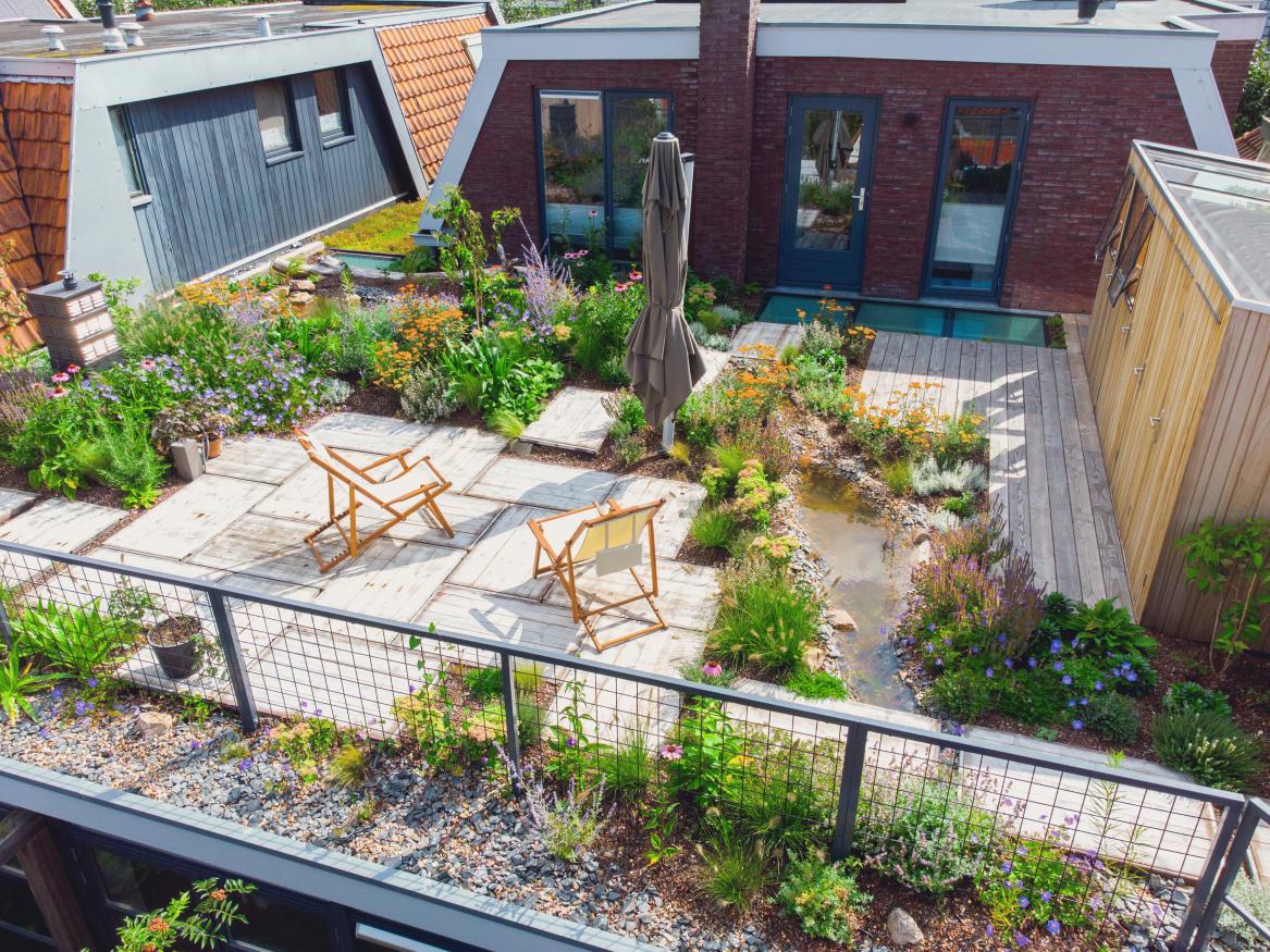 Deze daktuin met een rondstromende bergbeek is een fijne plek geworden met een mooi uitzicht. Veel insecten en vogels worden naar het dak getrokken door het kabbelende water tussen de bloeiende planten. Het water is zowel op het dak als op de begane grond te gebruiken voor bewatering voor de tuin.