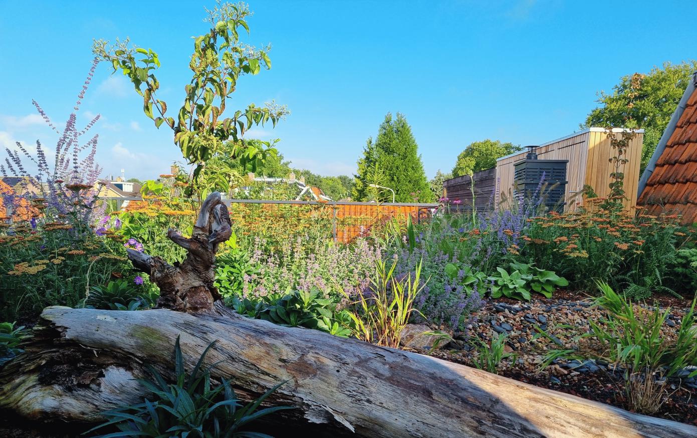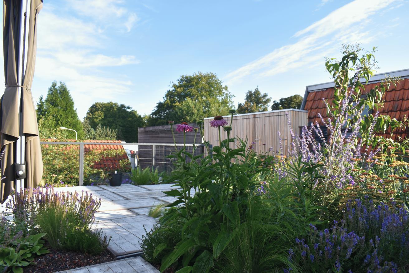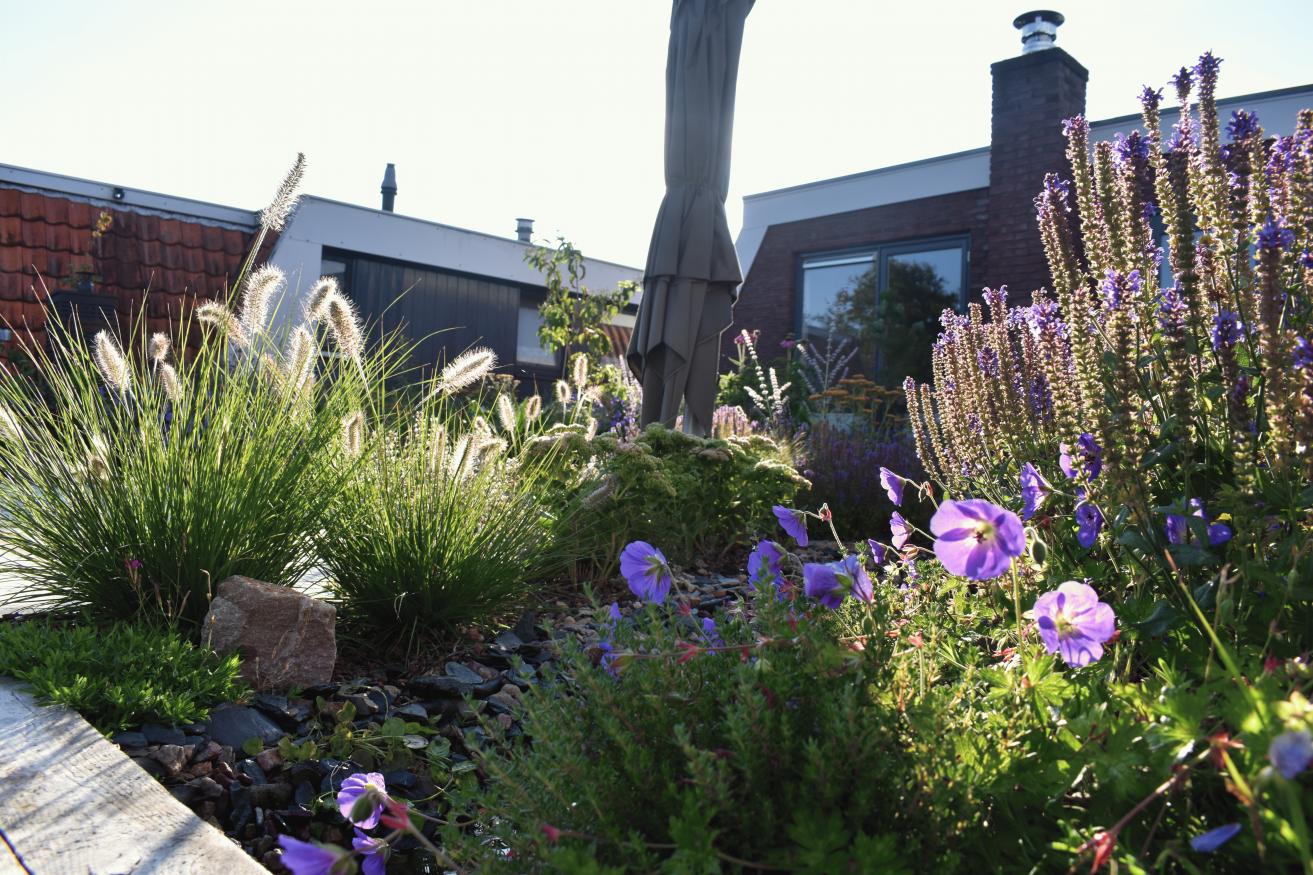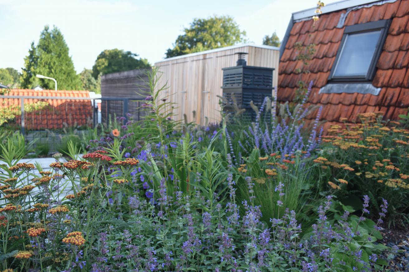 Deze daktuin met een rondstromende bergbeek is een fijne plek geworden met een mooi uitzicht. Veel insecten en vogels worden naar het dak getrokken door het kabbelende water tussen de bloeiende planten. Het water is zowel op het dak als op de begane grond te gebruiken voor bewatering voor de tuin.